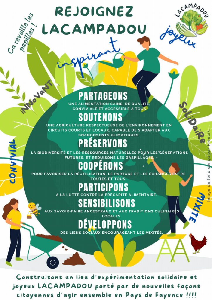L’alimentation et l’agriculture sont à l’origine des missions de LACAMPADOU : ateliers pour s’informer, expérimenter, se former (cuisiner / conserver / valoriser pour ne pas gaspiller ; permaculture / bouturer / greffer / gestion de l’eau/ Zéro déchet au jardin…), potager, verger, poulailler, conférences et ciné débats, café / resto collaboratif, lieu de distribution des associations AMAP Pays de Fayence et Court-circuit en lien avec le Relais solidarité …